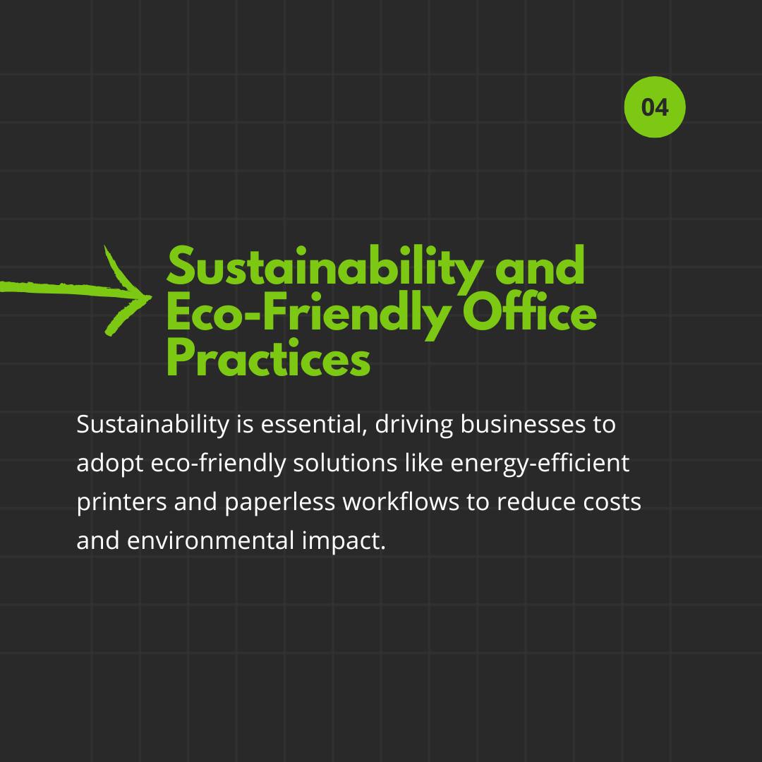 Sustainability is essential, driving businesses to adopt eco-friendly solutions like energy-efficient printers and paperless workflows to reduce costs and environmental impact.