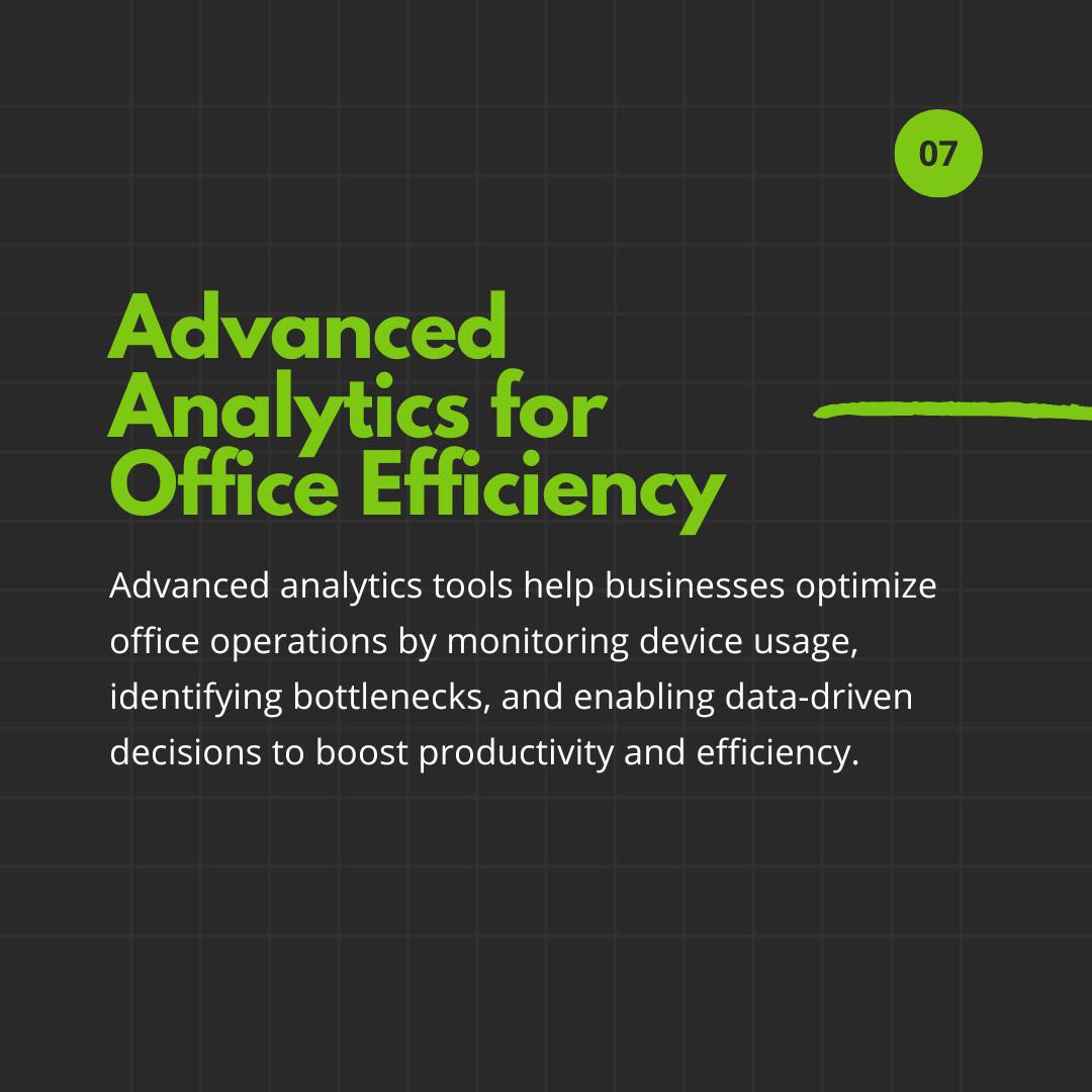 Advanced analytics tools help businesses optimize office operations by monitoring device usage, identifying bottlenecks, and enabling data-driven decisions to boost productivity and efficiency.