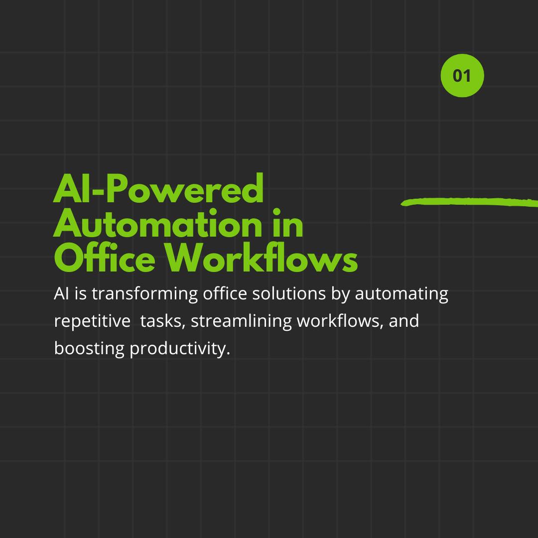 AI is transforming office solutions by automating repetitive tasks, streamlining workflows, and boosting productivity.