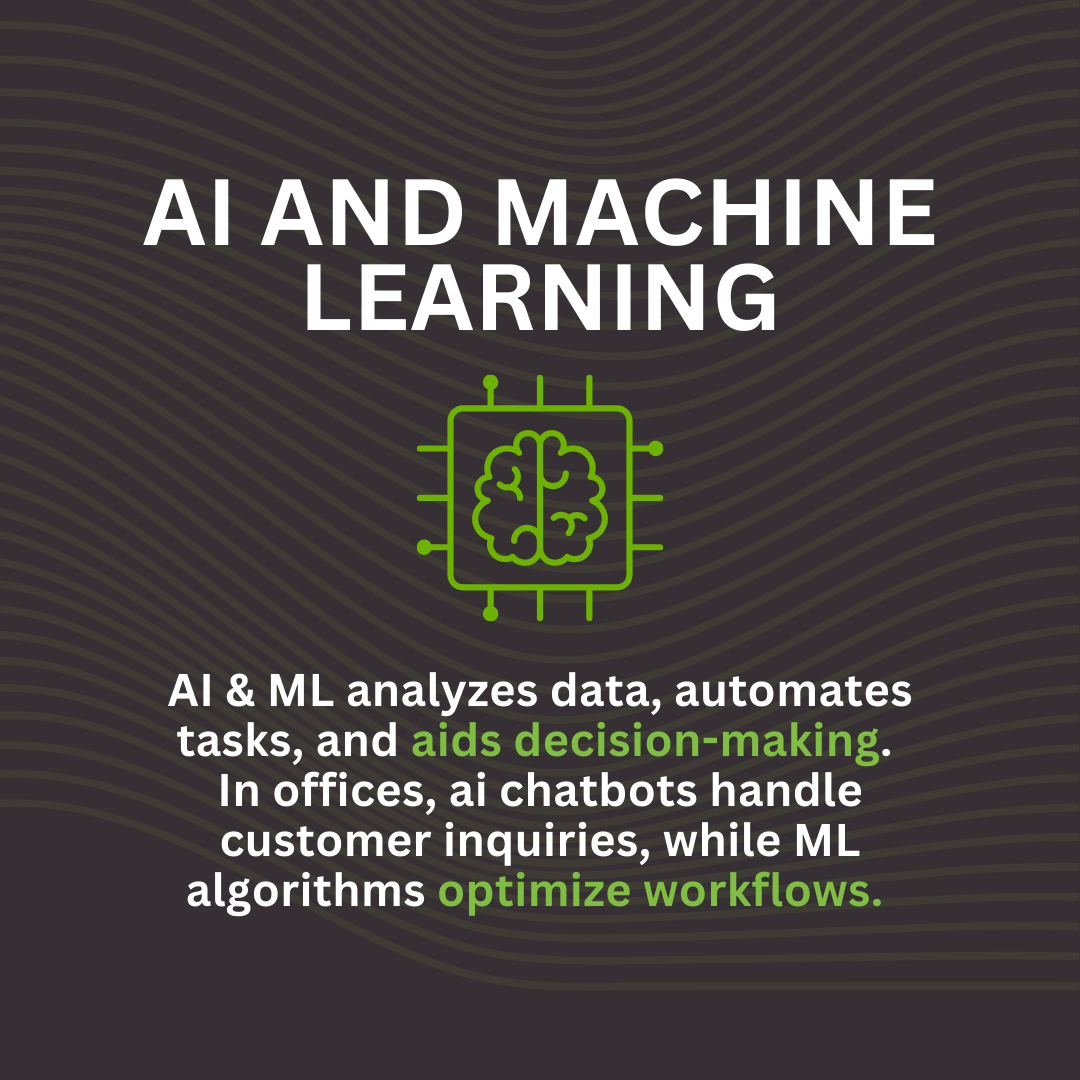 AI & ML analyzes data, automates tasks, and aids decision-making. In offices, ai chatbots handle customer inquiries, while ML algorithms optimize workflows.