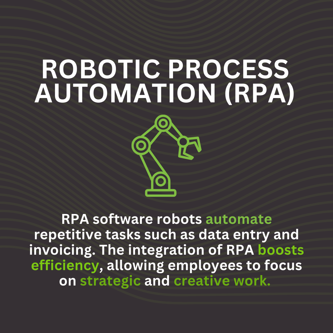 RPA software robots automate repetitive tasks such as data entry and invoicing. The integration of RPA boosts efficiency, allowing employees to focus on strategic and creative work.