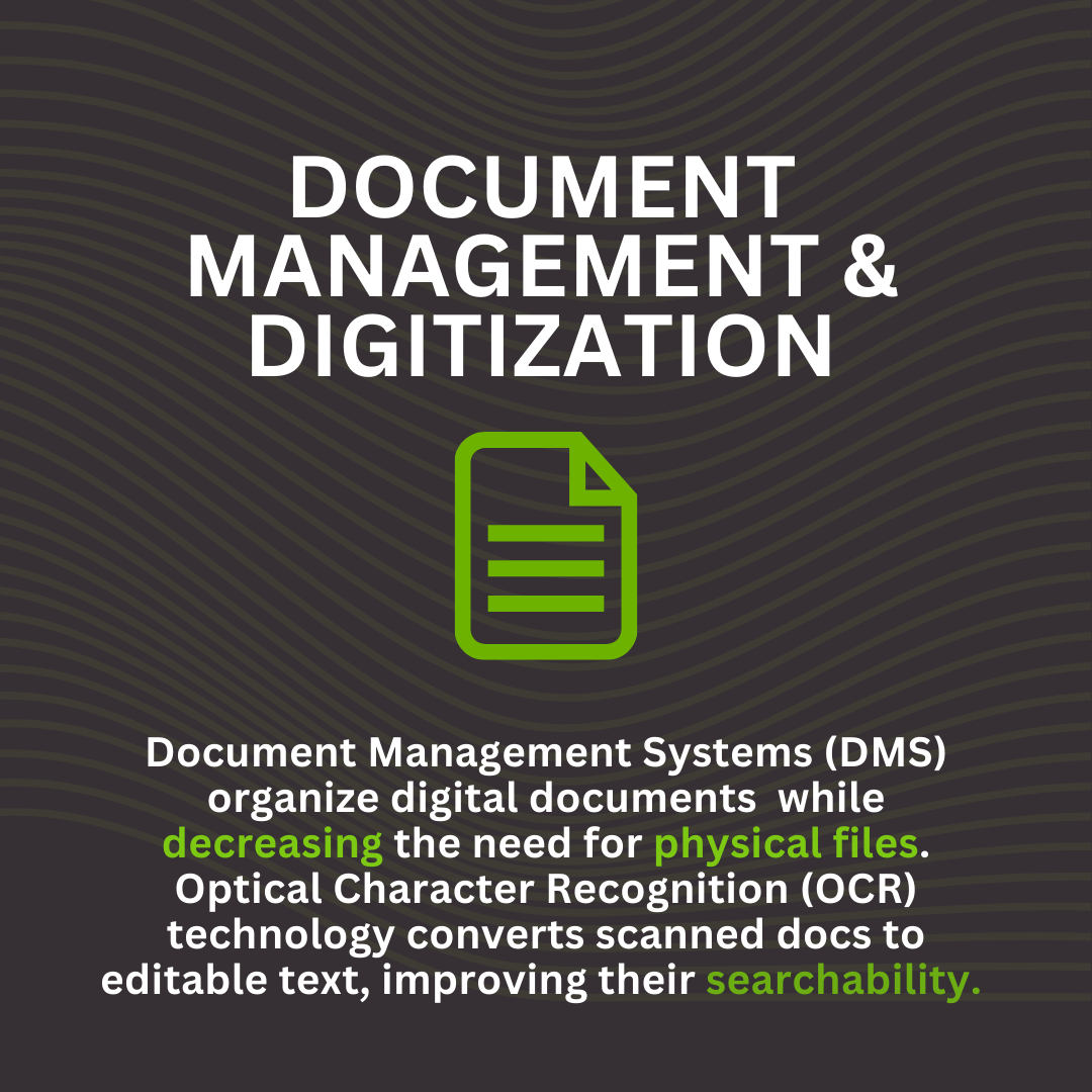 Document Management Systems (DMS) organize digital documents while decreasing the need for physical files. Optical Character Recognition (OCR) technology converts scanned docs to editable text, improving their searchability.