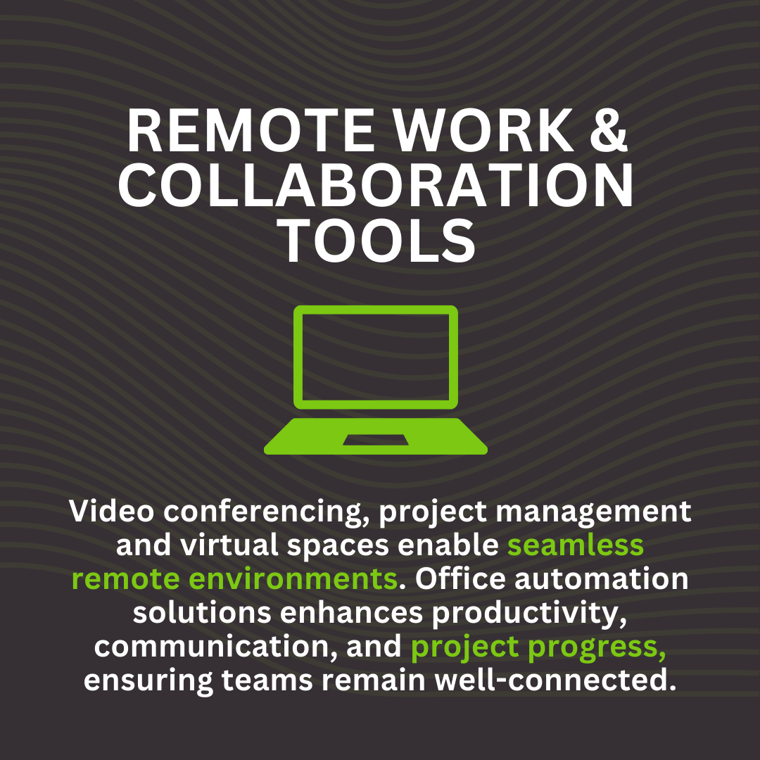 Video conferencing, project management and virtual spaces enable seamless remote environments. Office automation solutions enhances productivity, communication, and project progress, ensuring teams remain well-connected.